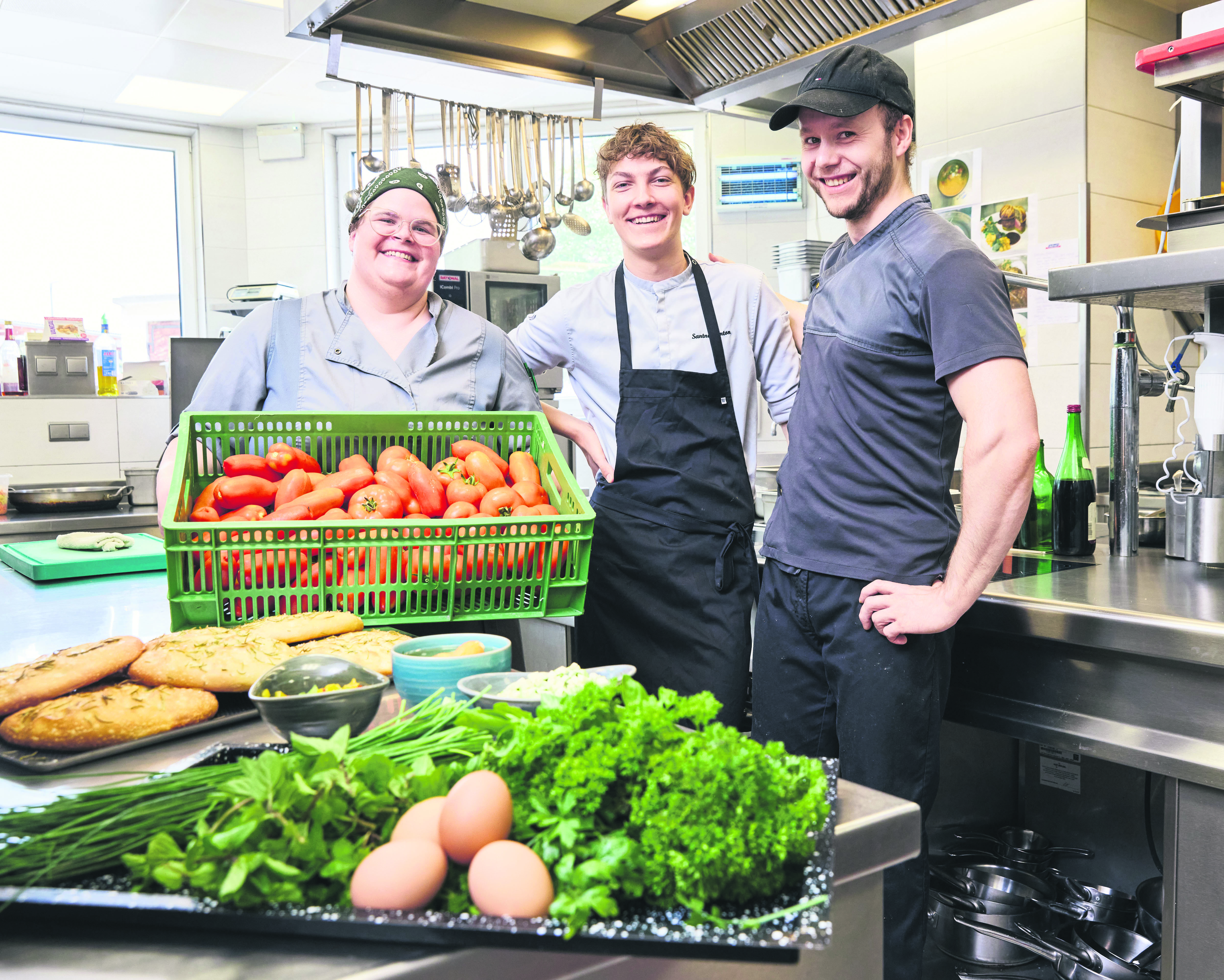 Anton Santner (Mitte) mit seinen Ausbildnern bzw. Kollegen Küchenmeisterin Theresa Nutz und Küchenmeister Martin Brandl.